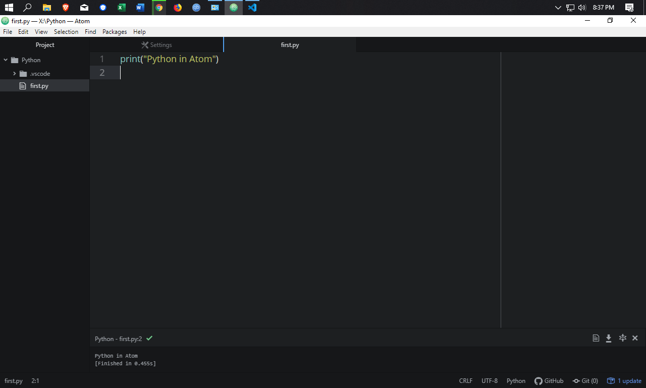 Save your script as a.py file in a directory. I will also talk about setting up atom to efficiently write and compile py. Searched the web, but can't find any relevant solution. Must add that i am using atom 1.26.1 x64 in ubuntu 16.04 Save your script as a.py file in a directory. Run python .py if you are using python2. Show activity on this post. This answer is not useful. I think there might be an issue with the atom path, as the same problem occurring with ruby, js & python. Open the terminal and navigate to the directory containing your script using cd command.. Searched the web, but can't find any relevant solution.